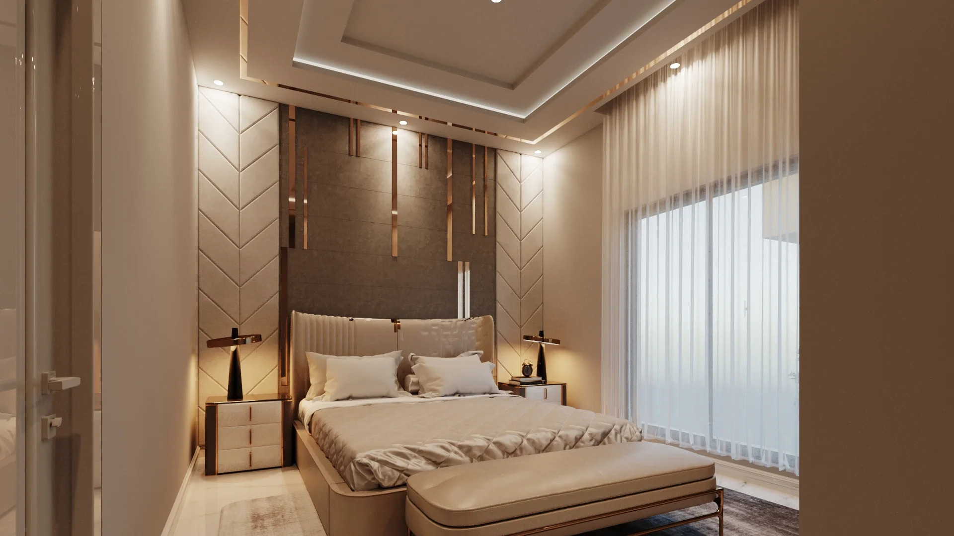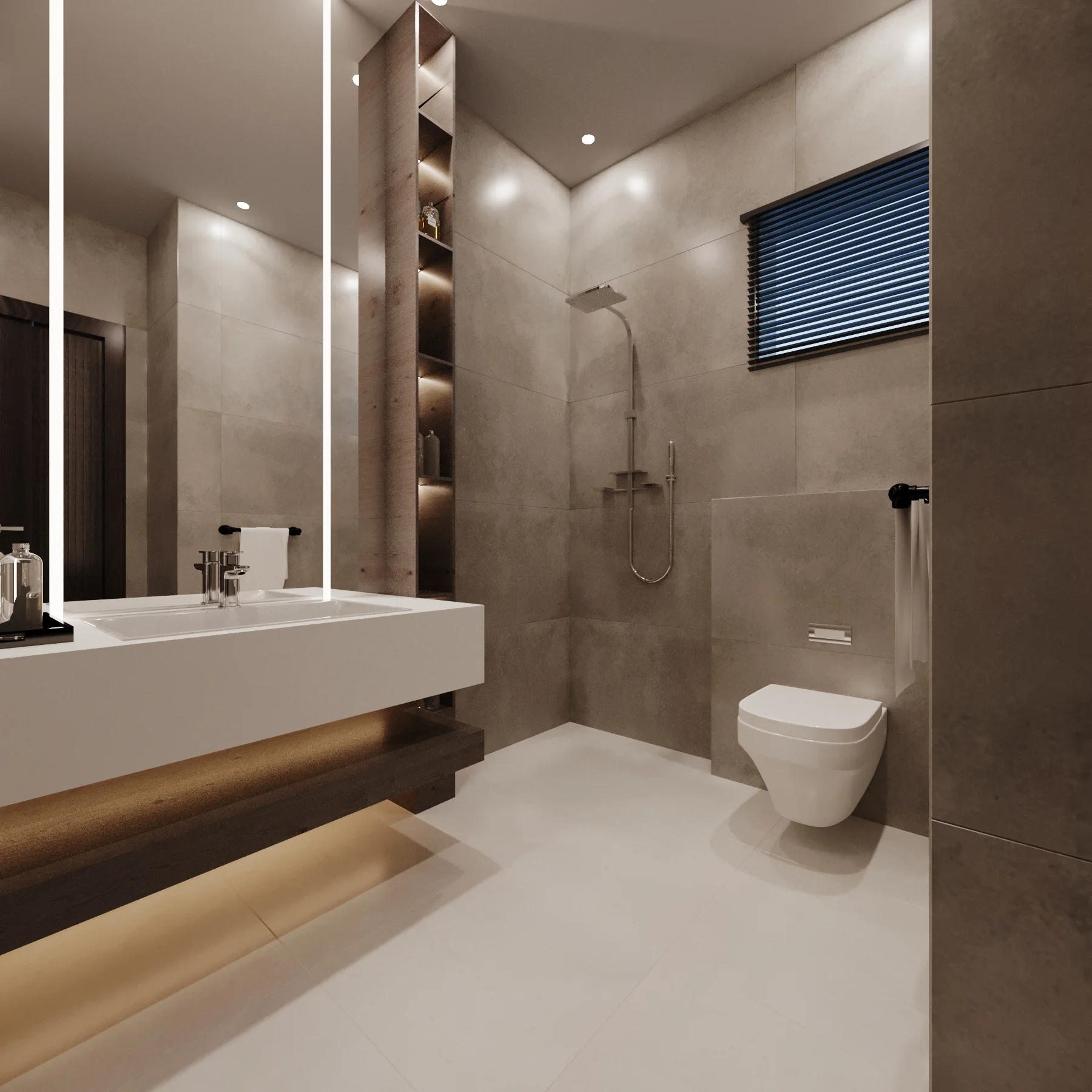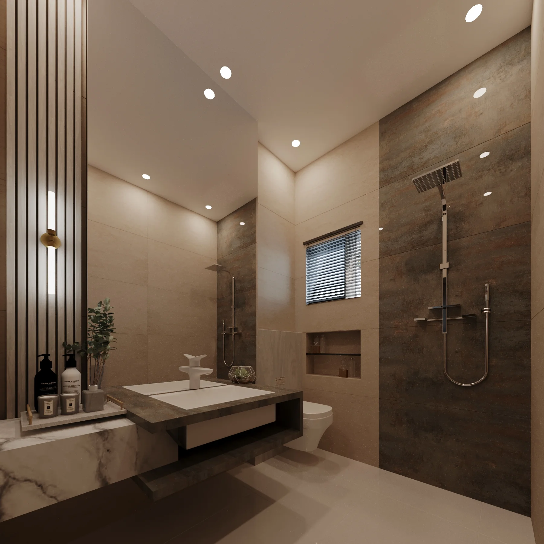 Ishaq Residence features high-end finishes, layered lighting, and unique textures to reflect its owner’s lifestyle. The space balances bold design elements with soft, livable surroundings.